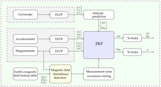 A mathematical model of quaternion-based orientation estimation is presented in Section 2.2. Based on previous sensor states, the sample period, and current gyroscope measurements, the prediction equation helps to calculate the sensor’s attitude and heading. The outcome of this stage is then used in the EKF fusion process. The model given in Equation (23) is eventually reformulated in the standard state-space model form, as shown in Equation (27).