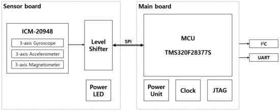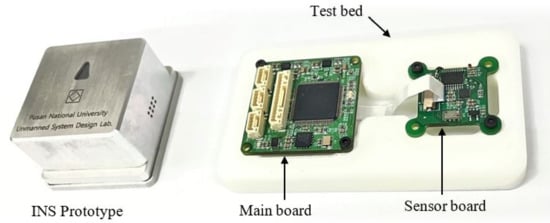 For functional verification of the proposed algorithm, an embedded inertial navigation system (INS) prototype was developed in this study. The prototype was equipped with an ICM-20948 9-axis MEMS TDK InvenSense device, and a Texas Instruments TMS320F28377S MCU for the proposed EKF algorithm computation and communication with peripheral devices.