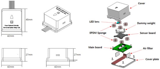 The sensor board and the main board are connected by a flexible flat cable and are designed to be physically secured with double-sided tape made of a soft ethylene propylene diene monomer (EPDM) sponge material. This is to minimize the effect of vibration due to the actuator operation of the INS mounted targets, such as drones and ground robots. Figure 4 shows the designed assembly configuration of the inner PCB parts and the outer cover of the prototype, and Figure 5 shows the actual sensor board and main board.