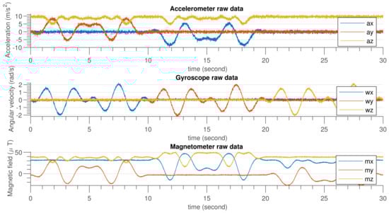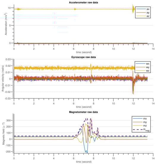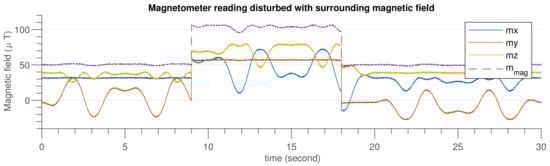 Figure 6 shows the IMU sensor data generated using MATLAB code by considering the specification given in Table 3. In Figure 7, an emulated external magnetic interference signal that was applied at the ninth second and lasted until the 18th second is shown.