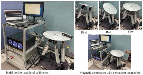 In the experiment, the magnetometer was carefully calibrated, as the workplace area was filled with different tools that could contain metallic materials that would create magnetic interference and affect the output of the experiment. Then, the motion table was operated to rotate around the X-, Y-, and Z-axes in sequence for specific times, under conditions with no significant magnetic disturbance, and in a magnetically disturbed environment by placing a magnetic bar in close vicinity to the motion table. Experiments were also carried out when the motion table was not moving to compare performance under static and dynamic conditions. Simultaneously, all raw measurement data from the sensors and estimated rotation trajectories were recorded.