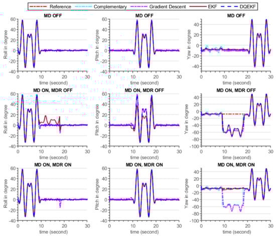 Attitude and heading estimation by complementary, gradient descent, EKF, and double quaternion-based EKF for three cases (Case 1: no magnetic disturbance (MD OFF), Case 2: with magnetic disturbance and no magnetic disturbance rejection (MD ON, MDR OFF), Case 3: with both magnetic disturbance and magnetic disturbance rejection enabled (MD ON, MDR ON)).