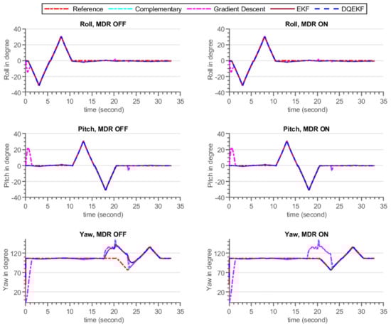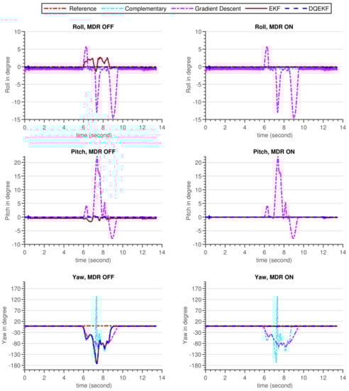 As seen in the simulation results demonstrated in Figure 9 and Table 5, complementary and DQEKF outperformed the other algorithms in terms of excluding the effect of magnetometer measurement on attitude estimation during magnetic disturbance condition, whereas gradient descent and EKF attitude estimation were directly affected by magnetometer noise because the attitude computation was not independent of the magnetometer readings. According to the analysis of observability of attitude by the magnetometer sensor discussed in Section 3.2.2, when employing the single quaternion-based EKF method, all four quaternion parameters were completely observable. This means that any changes in the magnetometer sensor data could have an effect on the attitude values. Therefore, the low performance of EKF and gradient descent approaches, during magnetic disturbance, was attributed to the coupling of magnetometer data and attitude in their mathematical models. Though complementary filter attitude estimation was unaffected by magnetic noise, its accuracy was lower than that of DQEKF since DQEKF was based on an efficient and advanced EKF algorithm.
