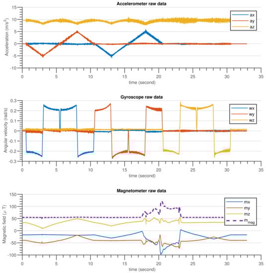 The validation procedure was carried out using the experimental setup specified in Section 5.2. A high-precision motion table was utilized to rotate the developed sensor around the inertial axes and serve as a ground truth reference. The performance of the built AHRS with the proposed algorithm and other commonly used algorithms was carefully examined in this experiment, for avoiding the influence of environmental magnetic disturbance on attitude and heading estimation. A permanent magnet was utilized to create an artificial magnetic disturbance in the surroundings. Figure 10 and Figure 11 show the raw sensors measurement data and the Euler angles estimated by the respective algorithms: complementary, gradient descent, EKF, and DQEK, respectively, while the INS sensor was stationary and magnetic disturbance was injected for small period of times. Furthermore, the same experimental scenario followed while the INS sensor was rotating by the motion table and the recorded results depicted in Figure 12 and Figure 13. Table 6 presents the empirical data analysis of the algorithms.
