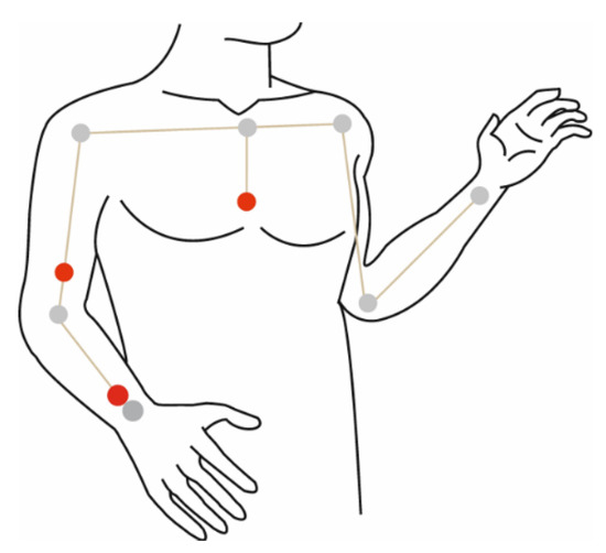Given today’s rapid innovations in information technology, paired with recent advances in wearable sensors, the field of activity recognition has gained more attention, especially in healthcare applications. These applications include activity recognition systems, can promote quality of life for patients, and support independent living without invading privacy. The physical activity recognition systems found in the literature can be categorized into those that follow the biomechanical approach and those based on the machine learning approach. As the name suggests, systems based on the biomechanical approach are developed according to biomechanical models of the human body. These models consist of segments of variable lengths and joints that connect the segments (represented by grey circles in Figure 1). Wearable sensors, mainly inertial measurement units (IMU), are used to capture human motion. To recognize an activity, the resulting joint angle is measured by placing IMUs on related body parts such as the bones, ligaments, and between the muscles (denoted by red circles in Figure 1).