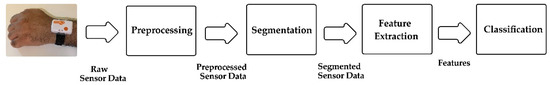 In contrast to systems based on the biomechanical approach, models based on the second approach use machine learning algorithms as their classification techniques. The overall process is explained in more detail in Section 2. Using this approach, the study in [12] proposed a system that uses a network of wearable sensors, along with an off-the-shelf smartphone, to identify the intensity of a set of upper-body strength exercises. The proposed approach consisted of a multi-layer hierarchical algorithm that uses support vector machine (SVM) to initially recognize the type of exercise, and then to identify its intensity. The results demonstrated the ability of the algorithm to recognize the type of exercise with approximately 85% in terms of overall accuracy. Biswas et al. [13] developed a methodology to recognize three fundamental upper-limb movements using data collected from a wrist-worn accelerometer and a gyroscope. The methodology drew on different classification algorithms, including linear discriminant analysis (LDA) and SVM, which achieved approximately 88% and 83% in terms of accuracy using data from the accelerometer and gyroscope, respectively. Panwar et al. [14] presented a model with the capability of recognizing three arm movements under real-time conditions. With a wrist-worn tri-axial accelerometer, the average recognition rate reported by the authors was 90% using hybrid evaluation methods.