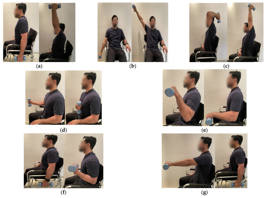 Physical activities used to rehabilitate spinal cord injury (SCI) patients: (a) shoulder flexion (SF); (b) shoulder abduction (SA); (c) elbow extension (EE); (d) shoulder internal rotation (SIR); (e) shoulder external rotation (SER); (f) elbow flexion (EF); and (g) shoulder extension (SE).