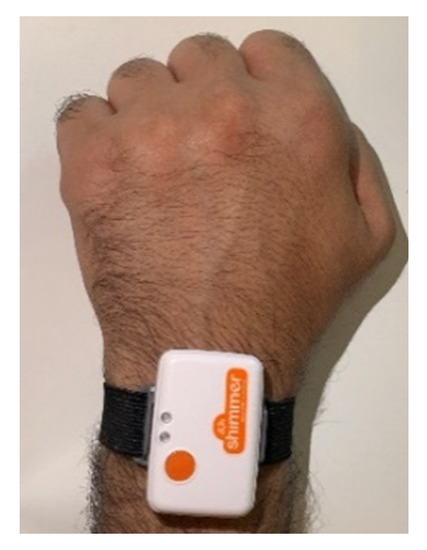 Substantial studies have been developed around the investigation of the impact of sensor position on overall recognition accuracy. These studies emphasize that sensor position is mainly determined by the activity under study. For upper-limb activities, sensors are placed on the wrist and upper arm to obtain the highest performance [25]. In this research, both positions were tested for data acquisition. However, sensors worn on the upper arm cannot detect certain activities, including EE, EF, and IR, since these activities lack upper arm movements. Consequently, the wrist was selected as the sensing position, as shown in Figure 4. In addition, a meta-analysis was undertaken in [26] to examine user preferences for sensor placement, which is an important aspect for the system to gain the required level of acceptance. The research indicated that people prefer wearing sensors on their wrist, followed by the trunk, belt, and, finally, the ankle.