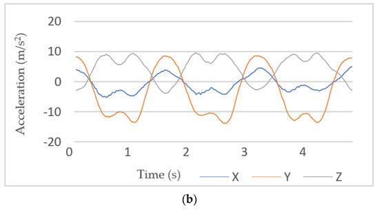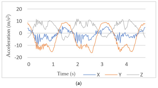 Due to the nature of external vibration, and/or sensor errors, the raw data acquired from wearable sensors mostly contain unwanted noise, as shown in Figure 5a. Hence, it is essential to preprocess the raw data to obtain a format that is considered representative of physical activities and suitable for predictive modeling [27,28]. Essentially, all measured body movements are expressed within frequency components below 20 Hz. Thus, it is necessary to remove high-frequency noise without losing information in the lower frequency bands. Different methods are available for noise reduction and smoothing. In this work, moving average filter (MAF) was used (Figure 5b). This has also been selected for similar studies, as in [29,30], which have approved of its efficiency. This is equivalent to low-pass filtering, which makes small perturbations insignificant to the model. Different values were evaluated, and it was found that a length equal to 10 produced smoother data without losing key information.