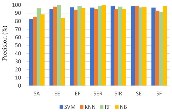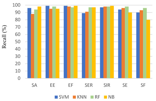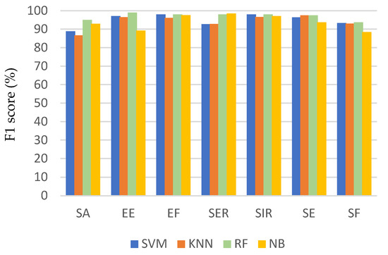 Figure 6, Figure 7 and Figure 8 show a comparison of the performance of the four classifiers on each activity, where the bars in the clusters represent the average recall, precision, and F1 score, respectively. Generally, most of the activities achieved a high recognition rate when classified by all the algorithms. Among the activities, the recall of flexion was the worst, especially for the SVM and NB classifiers, but it was still associated with a recognition accuracy of 80%. This can be attributed to the fact that these two classifiers frequently misclassified SF as SA or EE. Consequently, the precision of recognizing SA and EE was the lowest when using these two classifiers, but they achieved an average precision ranging from 80% to 88%.
