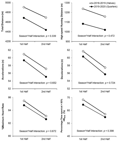 Table 4 shows the multilevel models examining the effects of season, position and half, as well as the effect of an interaction between season and half, on normalised GPS and heart rate variables (model 5). After controlling for these main effects, which showed no major differences from model 4, there was no evidence of a season by half interaction effect within model 5 for any of the dependent variables examined (total distance (p = 0.339); high-speed running (p = 0.472), accelerations (p = 0.652), decelerations (p = 0.724), percentage of maximum heart rate (p = 0.672) and percentage of time spent at >85% maximum heart rate (p = 0.398)). The lack of a cross-level interaction effect between season and half for the six dependent variables is visually presented in Figure 1.