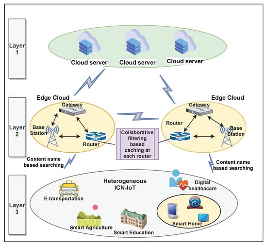 In recent years, the advancements in the internet of things (IoT) technology has gained a lot of popularity. Today, investigation on different forms for providing IoT as a solution is attracting both industry and academia, as well as seeking attention more than ever [,]. Unlike Wireless Sensor networks (WSNs), IoT offers tremendous scope for nodes and their connections. The recent progress ensures easy utilization of IoT in various applications, which include, but are not limited to, smart grids, smart education, intelligent transportation systems, e-healthcare, smart industries, smart agriculture, smart cities, smart homes, and wearables []. Due to the plethora of applications support from various disciplines, IoT has now become a bridge between human and real world for information communication. These extensive IoT applications, with almost different nature, have introduced complications in existing wireless communication systems and have, therefore, formed a heterogeneous IoT for today’s real information world. Although the current developments in mobile communication, with its newly launched 5G, offer enhanced mobile broadband (eMBB), massive machine type communication (mMTC), and ultra-reliable and low latency communication (URLLC), still, these heterogeneous IoT always possess higher requirements in terms of reliable connection, low cost, high speed, minimum delay, and scalable communication []. Due to limited resource constraints, such as storage and computing with IoT devices, these complex and diverse requirements of heterogeneous IoT tasks can be computed by effective utilization of cloud computing technology, where a network cloud has abundance of these resources. The ever-increasing growth in the IoT technology has offered various advanced functions to several IoT devices. For example, a smart phone today can perform various computations that was earlier possible only using computers or laptops. This simply corresponds to cloud computing in close proximity to users. However, with the massive data being generated by these heterogeneous IoT devices and extremely high latency offered during IoT to cloud communication, the simultaneous access by several IoT devices have demanded high bandwidth requirements. Therefore, the conventional single cloud computing model cannot satisfy all these requirements to meet quality of experience (QoE) []. The edge computing has been extended as a layer between cloud and IoT in this process of advancements to provide significant solution []. The edge cloud offers sufficient resources for computation and storage requirements []. Indeed, the different features offered by this edge computing model has provided various solutions in different domains, but it still faces different challenges, and research in this field is in its infancy []. The edge computing itself lacks intelligent computation and communication. The intelligent decision making for different computations based on different scenarios can be implemented by deploying artificial intelligence (AI) technology in the edge cloud and central cloud. The intelligent algorithms were generally deployed on these clouds to make them work smarter. The various fields where AI has proved its effectiveness include robotics, image processing, natural language processing, speech recognition, and so on []. Recently, cloud computing has started using AI’s cognitive services to offer better QoE. Moreover, the delays involved in current internet architecture for IoT content distribution due to its IP address-based approach where content has to be fetched from target device offers various challenges. This can be managed efficiently by leveraging information centric networking (ICN) communication in IoT and is referred as ICN-IoT [,].