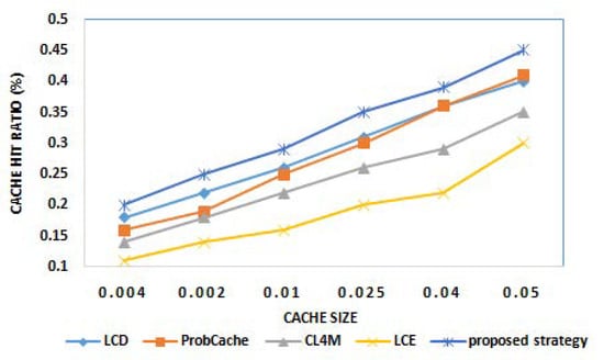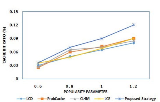 The cache hit ratio is the most important metric to examine the performance of any caching strategy. It determines the percentage of requests being served out of total generated requests. The high CHR always implies reduced burden on the core network as most of the requests are served by intermediate nodes. The initial round of experiments examine the performance of the proposed strategy for CHR. Figure 2 and Figure 3 show the cache hit ratio results of various caching strategies for different cache size and different popularity parameter , respectively. From the results obtained, it can be observed that the proposed strategy outperforms existing benchmark caching strategies for higher cache hit operations. The reason behind the better performance of the proposed strategy, among others, is due to caching content on edge devices based on content popularity and future prediction. With the increasing popularity of requested content, the more content would be cached at edge nodes, and, hence, higher CHR can be attained.