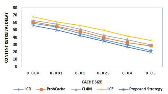 The next step of experiments work for interpreting the results of content retrieval delay offered by proposed strategy in comparison to benchmark caching strategies. This metric is mainly used to compute network latency. Figure 4 and Figure 5 show the result of content retrieval delay of various caching strategies for different cache size and different popularity parameter , respectively. The results clearly reveal the outstanding performance of the proposed strategy among other considered strategies for reduced retrieval delay with increase in cache size, as well as content popularity. The reduction in retrieval delay with gradually increasing cache size is due to higher cache capacity of edge nodes to cache content and provides data packets for user requests. Similar to this, less delay is observed for content having higher popularity because of its caching near the user.