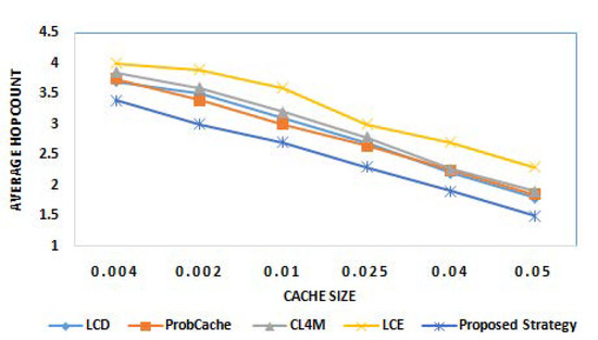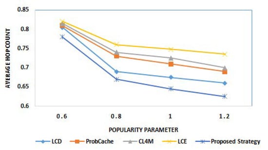 The last round of experiments investigated the performance of proposed strategy among aforementioned caching strategies, for comparison by considering another challenging metric, i.e., average hop count. Figure 6 and Figure 7 show the average hop count results of various caching strategies for different cache sizes and different popularity parameter , respectively. From the results obtained, it can be observed that the proposed strategy outperforms existing state of art caching strategies by reducing average number of hops traversed during content delivery operations. For the average hop count, the maximum improvement is recorded in case of proposed strategy (with varying cache size). This is due to the design model of the proposed strategy where caching at intermediate nodes is always aimed to reduce hop count with minimum delay. From the results in Figure 6, the continuous fall in average hop count value with growing cache size can be clearly observed for all caching strategies. This represents the direct significance of cache size on number of hops traversed. The decrease in count of hops with increase in popularity for all strategies can be seen in Figure 7. The caching of the most popular and future predicted content near the user is the reason behind the obtained results.