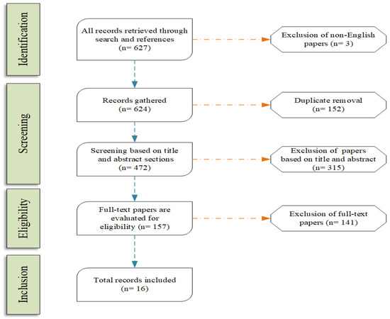 Figure 1 presents the flow of the steps that describe our survey method, which is based on PRISMA [7]. The first step was to gather all the documents (627 files) that has been detected in the academic field. We excluded articles written in languages we could not parse, removed duplicates, and moved on the evaluation of each detection. Some articles were excluded based on their title and their abstract (exclusion of 315 files), while other were rejected upon reading the full text body (exclusion of 141 files). The most common issue we faced was the detection of information that was tightly coupled with cross-dimensional fake news methods, and not a generic deception detection framework that applied to only one domain, language, or source. Finally, we included 16 articles in the core part of the survey. It is worth mentioning that we used additional literature for peripheral information of our survey, such as information about the presented datasets. We did not take them into account to the number of included files since they were not directly associated with our research questions.