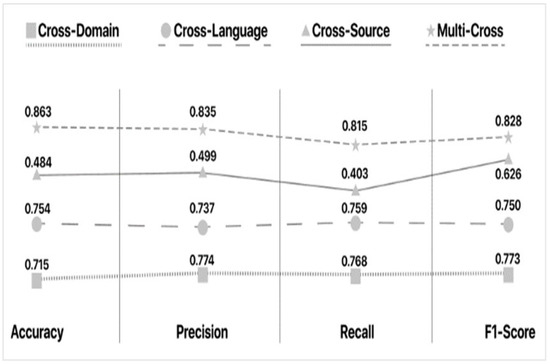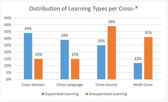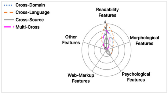 - The second parameter is related to the sector (domains/languages/sources) of each cross-category. Specifically, in Cross-Domain methodologies if an approach covers less than 3 domains then it is “Non-flexible”. In the case that the approach covers 3–7 domains, then it is “Relatively flexible”. Otherwise, it is “Flexible”. In Cross-Language methods, when an approach focuses on two languages, it is “Relatively flexible”, whereas when it focuses on three or more languages, it is “Flexible”. In the case of Cross-Source methodologies, if an approach uses data from less than 10 sources, it is “Non-flexible”. When it uses data from 10 to 100 sources, then it is “Relatively flexible”. Otherwise, it is “Flexible”. In the case of Multi-Cross methodologies, if the approach covers two cross-categories, it is “Relatively flexible”, otherwise it is “Flexible”. According to the categories to which this approach belongs, we separately calculate the adaptability of the related sectors. For instance, we consider a Multi-Cross methodology (A) that is Cross-Domain and Cross-Language. To characterize (A), we take into account the criteria related to Cross-Domain and Cross-Language methodologies, while ignoring Cross-Source-related criteria.
