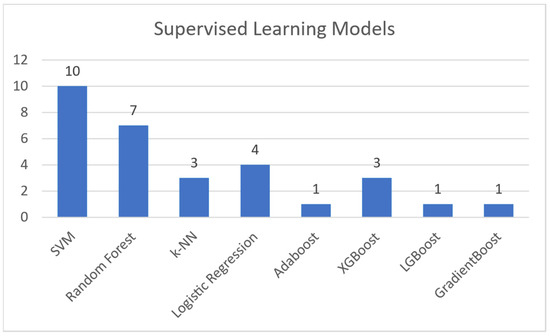 Supervised learning uses a set of labeled data. Such algorithms learn how to map specific inputs to appropriate outputs through guided information. Each label indicates the correct (or erroneous) answer that the model should predict (or not). The initial dataset (if there is only one) is usually split into training and testing data. The training set assists the model by “teaching it” patterns for prediction or classification, while the testing set is used to gauge its capacity in completing those tasks. The process is named “supervised learning” [16,17,18].