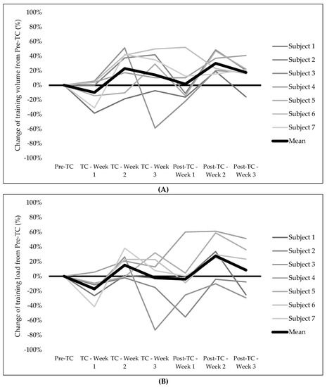 In this observational study, the subjects followed their individualized training program. As can be seen in Figure 1A, the training volume changed by −10% in the first week of the TC. However, this variation from the Pre-TC to the first week of the TC ranged between 4% and −38% among the subjects. Regarding the TL (Figure 1B), the first week of the TC changed by −17%; this variation ranged between 6% and −41% among the subjects. Mujika et al. [5] recommended reductions of the training volume and load during the initial days of an altitude training camp. However, this recommendation may vary among different subjects depending on different factors such as their previous experience in altitude training or their individual response to hypoxia. During the following weeks of the TC and the Post-TC, the training volume and the TL tended to increase but with high differences among all the subjects. The highest increases in training occurred during the last weeks of the Post-TC.