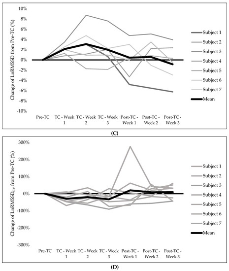 LnRMSSDcv showed a mean change of −30% during the first week of the TC and the individual change ranged between 6% and −69%. Thus, it seems that the exposition to moderate levels of hypoxia did not produce enough stress to induce reductions in the vagal activity in this population and this reduction could be due to the concomitant reduction in the TL, as seen before in other sports [37,39,40]. It is important to note that these markers evolved differently among individuals. For example, subject 5 experienced a reduction of LnRMSSD during weeks 2 and 3 of the TC. In contrast, subject 3 showed the inverse response with large increases (8–9%) during the same mentioned weeks (see Figure 1C). Therefore, the use of these vagal markers could be used to detect the different responses during the training and, consequently, individualize the training prescription to optimize increases in performance [41] and avoid overtraining [42].