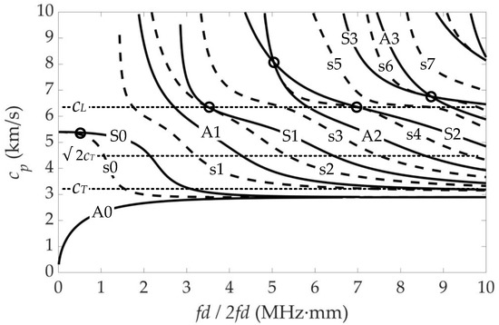 It has been discussed that symmetric Lamb waves in plates generate cumulative second harmonics under some special cases in Section 2. In fact, each internal resonance point is valid in a region that is dependent on the frequency bandwidth associated with the toneburst excitation and phase velocity bandwidth associated with the finite sensor size [2,31,36]. In this work, the nonlinear models were used to simulate by using aluminum plates with , and the material parameters representative of aluminum are listed in Table S1 [22,37]. The phase velocity dispersion curves of the RL waves of the aluminum plate are plotted in Figure 2. The fd product for the primary modes, and 2fd for the second harmonics have been provided. The primary modes are plotted with solid lines and identified by upper case letters (e.g., A0, A1, S0, S1), and the secondary modes are plotted with dash lines and identified by lower case letters (e.g., s0, s1, s2, s3), where A and S(s) represent the antisymmetric mode and the symmetric mode, respectively.