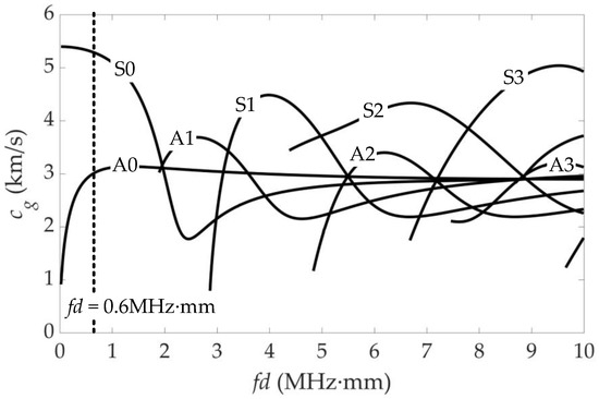 A number of internal resonance points satisfying both synchronism and nonzero power flux are marked in Figure 2, which are represented as primary–secondary mode pairs. Although the S1–s2 mode pair is commonly used in a plate as a nonlinear Lamb wave measurement [1,2], it is difficult to preferentially actuate the S1 mode at the point due to the proximity of other modes (especially A1 mode) and the wide variety of modes. However, the S0–s0 mode pair has the ability to avoid multi-mode interference. On the other hand, the S0 primary mode has a strong excitation and minimal dispersion at the low frequency region, and the s0 secondary mode has a strong receptivity [32]. Therefore, the S0 mode Lamb wave at the internal resonance point of was chosen as the primary mode. The phase velocity cp dispersion curves of the primary modes in Figure 2 are converted into the group velocity cg dispersion curves and are plotted in Figure 3. At , only A0 and S0 modes exist as the primary modes in the aluminum plate, whose cg differ greatly. This is conducive to actuation of pure S0 mode, identifying and extracting the S0 mode among the time domain signals.