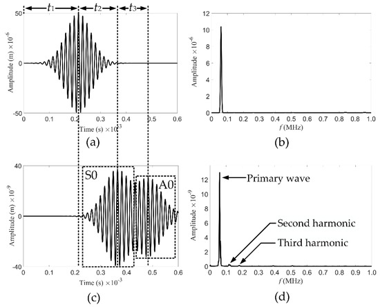 While the second harmonics were generated, RL wave motion also existed at the third harmonic frequencies, as shown in Figure 9b. It can be observed that the third harmonics also have obvious cumulative effect of power flux in the frequency spectra of the signals received by the opposite side sensor. Therefore, a numerical study was carried out to study the effect of harmonic orders.