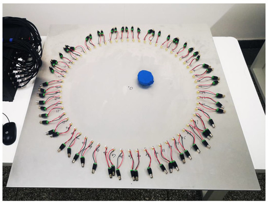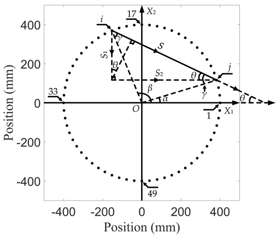 In a sensor array, every two sensors can be formed as an actuation–reception pair, and all actuation–reception pairs form a network over the detected area. In the X1–X2 plane, the sensor located in the positive direction of X1 was labelled as sensor 1, and increased the label number by 1 in the counterclockwise direction, as shown in Figure 6.