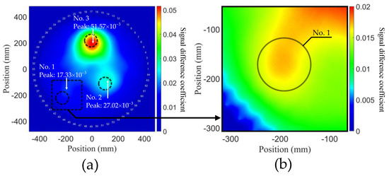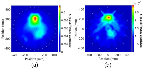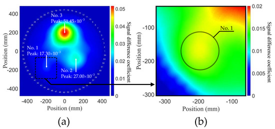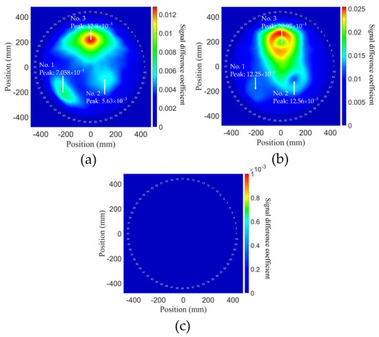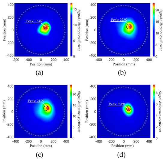 A guided wave signal processing platform had been developed for tomography with abundant acoustic features, including nonlinear harmonics, attenuation and SDC, etc. [40]. This section will compare the results reconstructed by the attenuation, maximum peak (MP), covariance and NGW methods, whose peak values of total SDC with TOECS are all plotted in Figure 9a.