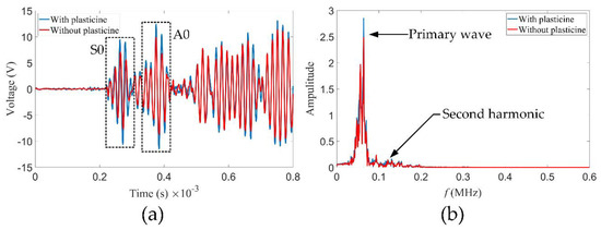 (a) Time domain signals when the plasticine is on the vector of an i–j pair. The signals of the aluminum plate without plasticine are shown as blue lines, and the ones of the aluminum plate with plasticine are shown as red lines. (b) Frequency spectrum corresponding to (a). The central frequency of the excitation signal is 60 kHz.
