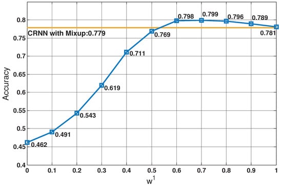 Classification accuracy with different weights. The blue line indicates the classification accuracy of different weights cases, while the orange line indicates the accuracy of CRNN with mixup system.