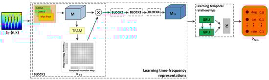 The entire network architecture with CRNN and four TFAM blocks are depicted in Figure 4, where the final learned feature map, , is forwarded to bi-directional GRU for the temporal processing. The overall classification results, , are obtained from a fully connected network, with dimension .