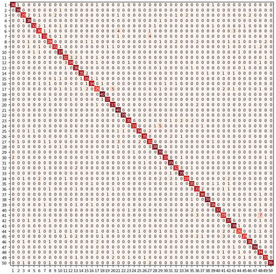 In addition, Figure 5 shows the confusion matrix when the classification accuracy is 86.4%. The confusion matrix fully displays the correctness and wrongness of the classification of each class. The horizontal axis and vertical axis in the figure, respectively, represent the predicted labels and the true labels of 50 classes of environmental sound. Among them, the corresponding relationship between the number from 1 to 50 and the environmental sound class is: 1—Dog; 2—Rooster; 3—Pig; 4—Cow; 5—Frog; 6—Cat; 7—Hen; 8—Insect (flying); 9—Sheep; 10—Crow; 11—Rain; 12—Sea waves; 13—Crackling fire; 14—Crickets; 15—Chirping birds; 16—Water drops; 17—Wind; 18—Pouring water; 19—Toilet flush; 20—Thunderstorm; 21—Crying baby; 22—Sneezing; 23—Clapping; 24—Breathing; 25—Coughing; 26—Footsteps; 27—Laughing; 28—Brushing teeth; 29—Snoring; 30—Drinking, sipping; 31—Door knock; 32—Mouse click; 33—Keyboard typing; 34—Door, wood creaks; 35—Can opening; 36—Washing machine; 37—Vacuum cleaner; 38—Clock alarm; 39—Clock tick; 40—Glass breaking; 41—Helicopter; 42—Chainsaw; 43—Siren; 44—Car horn; 45—Engine; 46—Train; 47—Church bells; 48—Airplane; 49—Fireworks; 50—Hand saw.