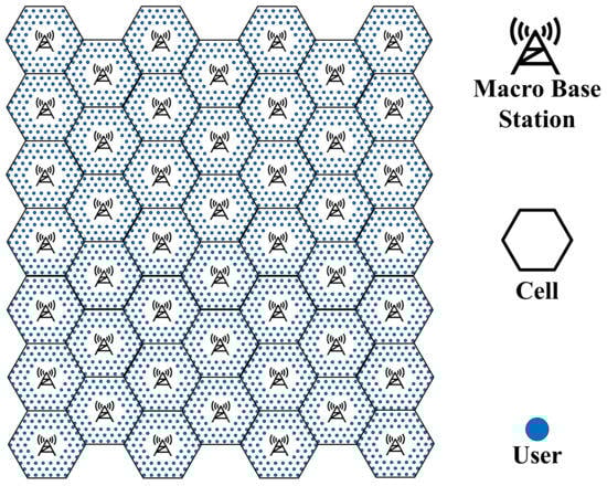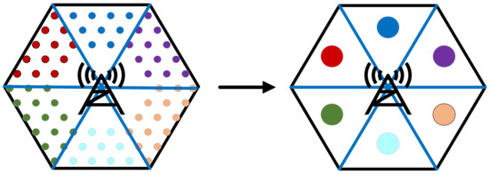 To solve the problem in which the scale of () grows with the number of users, user clustering is adopted in this work. Each cell m is evenly divided into six sub-cells mi (i = 1, 2,…, 6), as shown in Figure 4. All users in the same sub-cell mi belong to user cluster mi and are deployed as a whole. In this way, the number of binary variables in () is greatly reduced and does not increase with an increase in the number of users in the network.