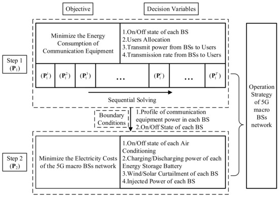 The two-step energy management model for the 5G macro-BS network is illustrated in Figure 3. First, the energy consumptions of the AAU and BBU are minimized by optimizing the on/off state of the BSs and user allocation in the cellular network during each time period. Given the power profile and on/off state of each BS, the injected power of each BS, the on/off state of ACs, the charge/discharge power of backup batteries, and the power of renewable generation units during each time period are jointly optimized to achieve the goal of the economic operation of the 5G macro BS network.