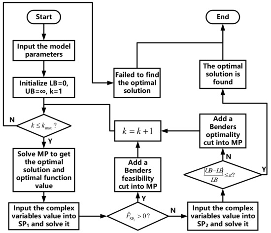 The Benders decomposition algorithm [35] is extensively applied to decompose large-scale MILPs. By selecting complex variables from all variables in (P2), the problem is decomposed to a master problem (MP), a feasibility subproblem (SP1), and an optimality subproblem (SP2) to decrease the complexity of the original problem. In this study, all integer variables (, , and ), and all AC-related continuous variables (, , and ) in (P2) are included in the MP, and the other continuous variables are included in the SPs. The flow chart of the Benders decomposition algorithm applied to (P2) is shown in Figure 5. The specific application steps are as follows: