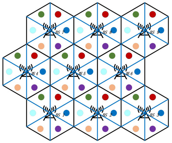 The simulated 3 × 3 5G macro BS network is shown in Figure 6 with the geographic distribution of each cell. The dot in each subcell represents the cluster of all users in that subcell. The traffic load, renewable generation power, and electricity price profiles are shown in Appendix A.