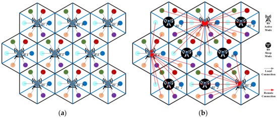 On/off states of BSs and cluster association strategy: (a) peak period of traffic load and (b) valley period of traffic load.