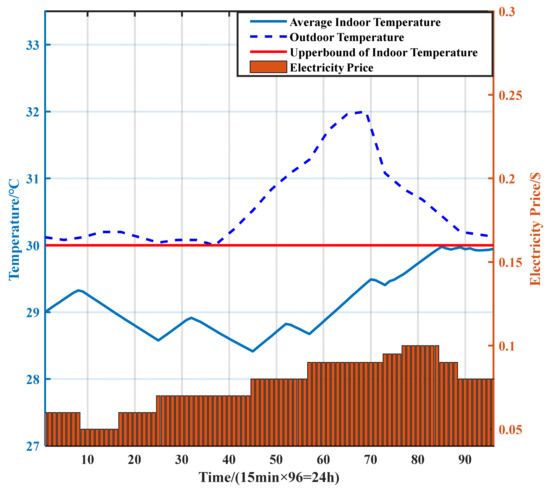 The average indoor temperatures are shown in Figure 8. To ensure the normal working status of the BSs, the AC needs to maintain the temperature inside the cabinets below the upper bound of the indoor temperature. The thermal inertia of the cabinet can be used to shift the power consumption of the air conditioner. When the electricity price is relatively low, such as in periods 9–24, the AC is turned on to reduce the indoor temperature to a low level, while in instances in which the electricity price is high, such as in periods 25–31, the AC can be turned off. The indoor temperature would not reach the upper bound of the indoor temperature owing to the thermal inertia of the cabinets.