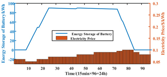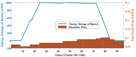 Finally, the backup batteries are allowed to charge and discharge with DS 1. The total energy storage of backup batteries in the 5G macro BS network is shown in Figure 12. The analysis of the dispatching scheme of batteries is consistent with that described in Section 4.1.2. By storing and releasing power from the grid over time, the power during the low electricity price period is transferred to the period with a high electricity price. Compared with DS 2, where the batteries are not allowed to be dispatched, the proposed DS 1 effectively reduces the electricity costs of the network.