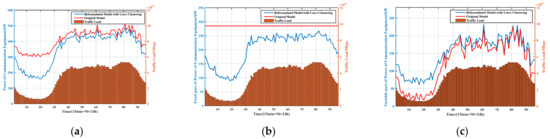 First, we compared the dispatching scheme of the communication equipment based on the use of two strategies. The total power, fixed part of the power, and variable part of the power of the communication equipment are shown in Figure 10a–c, respectively.