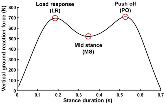 An illustration of the VGRF curve for a single step. The red circles denote three stereotypical time points for each step; the time point of load response (LR), mid stance (MS), and push off (PO). The LR and PO are the time points of two peaks of the double bump pattern of the VGRF curve, and MS is the time point of the minimal value of VGRF between LR and PO.
