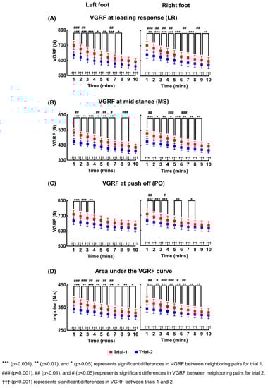 For both trials and both feet, pairwise comparisons revealed that the estimated VGRFs and impulse during a time interval of one minute were less than the estimated values during the next minute with statistical significance in most neighboring pairs. The number of neighboring pairs without statistically significant change always increased in the second trial compared to the first trial for all the four measures and both feet. Pairwise comparisons between trials also revealed that the VGRFs and impulse of 20 participants in the first trial were significantly larger than those in the second trial at any one-minute time interval for both feet.