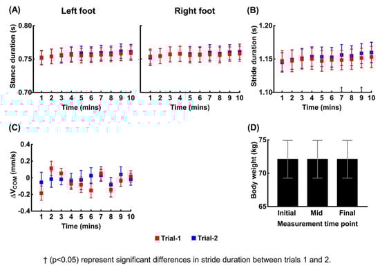 The measures used to assess whether the time-dependent decrease in the VGRF is due to alterations in kinematics or dynamics during walking. (A–C) show the means and standard error bars of the stance durations of the both feet, stride durations, the difference in the values of the vertical center of mass velocity between the beginning of one stride and the next one (ΔVCOM) for 20 participants averaged over every one-minute time interval for the two trials. (D) shows the means and standard error bars of the body weights (BW) for 20 participants for three measurement time points: initial (before the first trial), mid (between the first and second trial), and final (after completion of the second trial). BW remained exactly same for all participants across the three time points.
