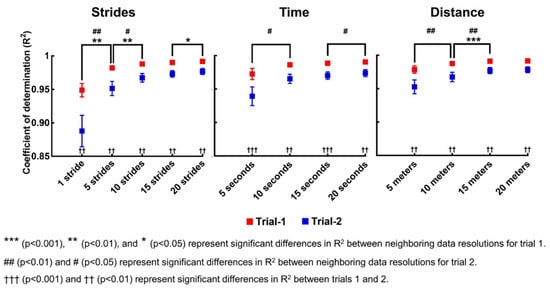 We assessed the model’s goodness of fit by calculating the coefficient of determination (R2) between ΔI and ΔIfit after the iteration, separately for each participant and trial. The values of R2 indicate the proportion of variance explained by the curve-fitting model used to encapsulate the error between ΔI and ΔIfit. Considering that the model might be sensitive to a slight fluctuation in ΔI during each single stride, we additionally assessed the model’s goodness of fit after downsampling the data by averaging ΔI over 5, 10, 15, and 20 strides. It is also highly plausible that the error depends more directly on the distance traveled by the treadmill belt or the operation time of the treadmill rather than the stride number. To address this, we calculated the R2 values after fitting ΔI with respect to time and distance. Again, we performed the curve fitting after downsampling the data by averaging the ΔI over 5, 10, 15, and 20 s; and 5, 10, 15, and 20 m.