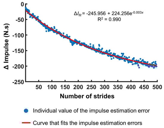 To find the optimal ΔIinitial, k, and ΔIsteady iteratively, we need to select their proper initial values for the iteration. We chose initial ΔIinitial as the error in the impulse measurement during the first stride. We chose the initial k as the overall slope of the impulse error with respect to stride, calculated between the last and first strides. Finally, we chose the initial ΔIsteady as the value of the error at the final stride. We iterated the values of ΔIinitial, k, and ΔIsteady using unconstrained multivariate optimization to find the values making ΔIfit closest to the true error, which we calculated as,