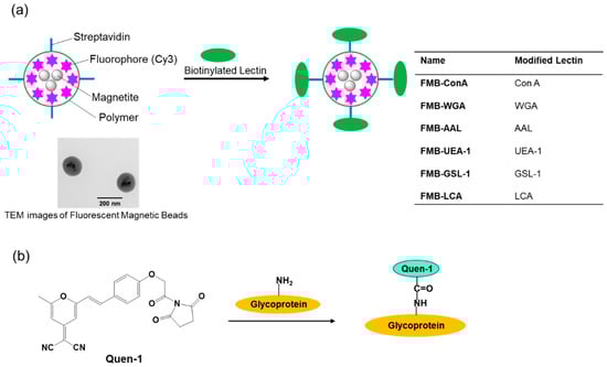 Schematic representation of the immobilization of lectins onto the surface of fluorescent magnetic beads (designated as FMB-Lectin; Lectin: Con A, WGA, AAL, UEA-1, GSL-1, or LCA) (a) and the labeling reaction between fluorescent quenchers and glycoproteins (b).