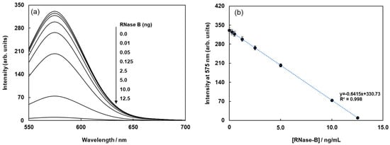 Fluorescence spectra of FMB-Con A before and after the addition of RNase-B modified using Quen-I (a), and plots of the fluorescence intensities of FMB-Con A at 575 nm against the concentrations of RNase-B modified using Quen-I (b). [FMB-Con A] = 10 μg/mL; [RNase-B] = 0~12.5 ng/mL; Solvent, PBS buffer solution, pH 7.0; Excitation wavelength, 550 nm.