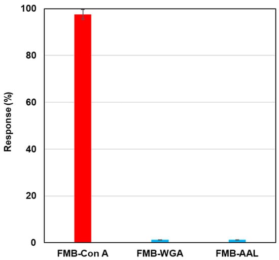 To investigate the selectivity of lectin-labeled fluorescent magnetic beads against various glycoproteins, biotinylated lectins, such as Con A, wheat germ agglutinin (WGA), and aleuria aurantia lectin (AAL), were modified on the surface of streptavidin-based fluorescent magnetic beads (FMB-WGA and FMB-AAL), and fluorescence intensities were monitored after the addition of RNase B modified by Quen-1. Figure 3 shows the results of selectivity tests. FMB-Con A showed a high affinity towards α-Man, and its fluorescence response was highest, and FMB-WGA and FMB-AAL showed no responses towards RNase B, because WGA has a high affinity to the GlcNAc family and AAL has a high affinity for fucose. These lectins have no affinities toward mannoside branches. Based on these results, the fluorescence responses of fluorescent magnetic beads indicated the high affinities between lectins and glycoproteins, and the selectivity of lectin-glycome interactions could be monitored with the sensing system.