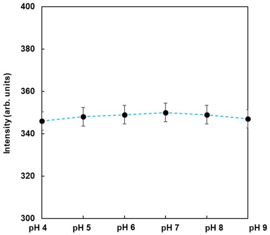 To observe the dependence of pH on the fluorescence from FMB-ConA, the fluorescence intensities of FMB-ConA were monitored at different pH values ranging from 4 to 9. The data are shown in Figure 4. As a result, the fluorescence intensities were nearly unchanged when the pH was in the range of 4 to 9, whereas the fluorescent magnetic beads in the author’s previous study were affected due to pH [23]. This was due to the fact that the fluorophores in this study were encapsulated in magnetic beads and surrounded by poly GMA, which contributed to pH independence. On the other hand, fluorophores in a previous study were immobilized on the surface of magnetic beads, and their fluorescence intensities were affected due to pH. As a result, FMB-ConA satisfied the experimental conditions for the in vitro analysis of lectin-glycoprotein interactions, and this method can be applied to investigate real samples in the field.